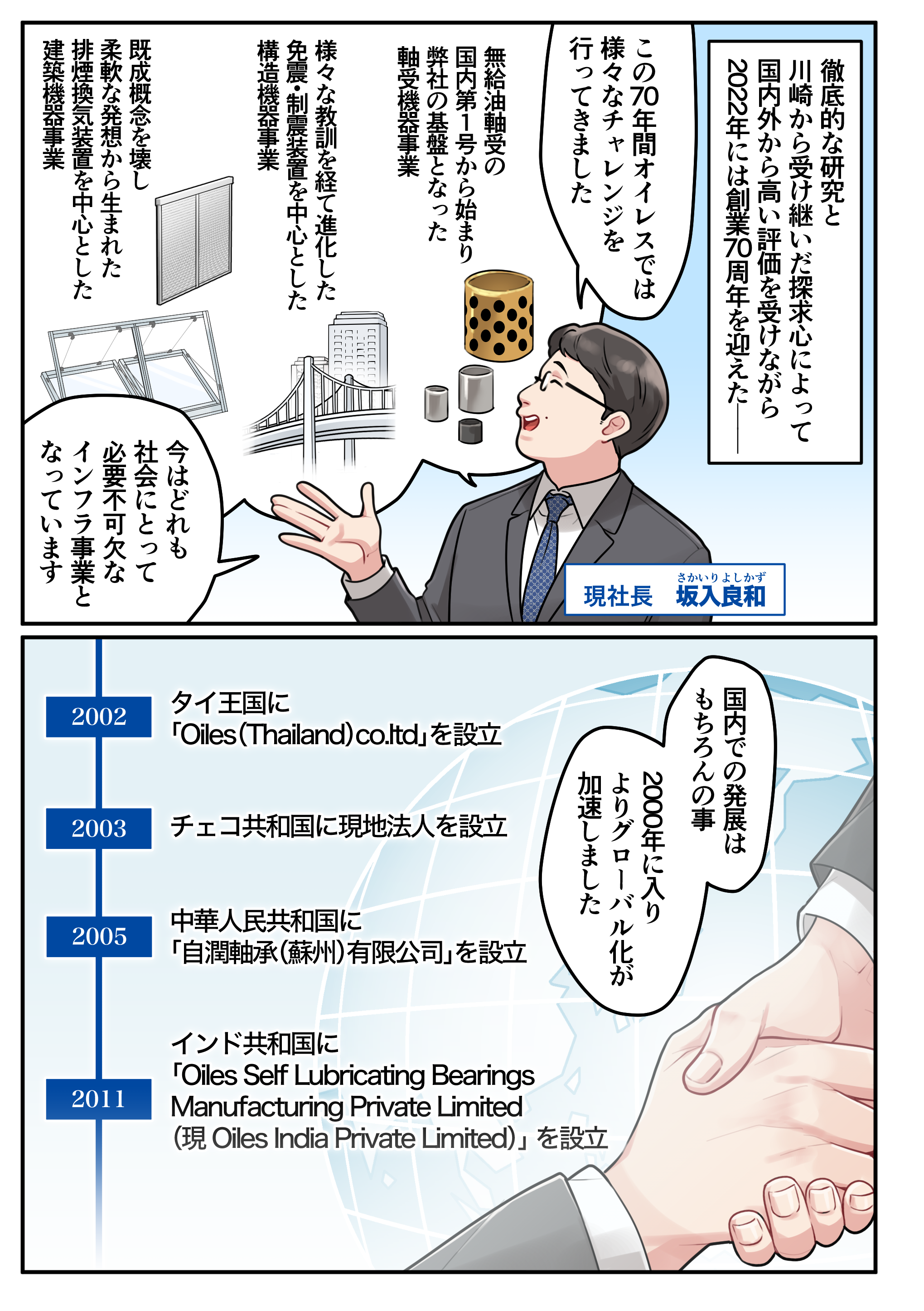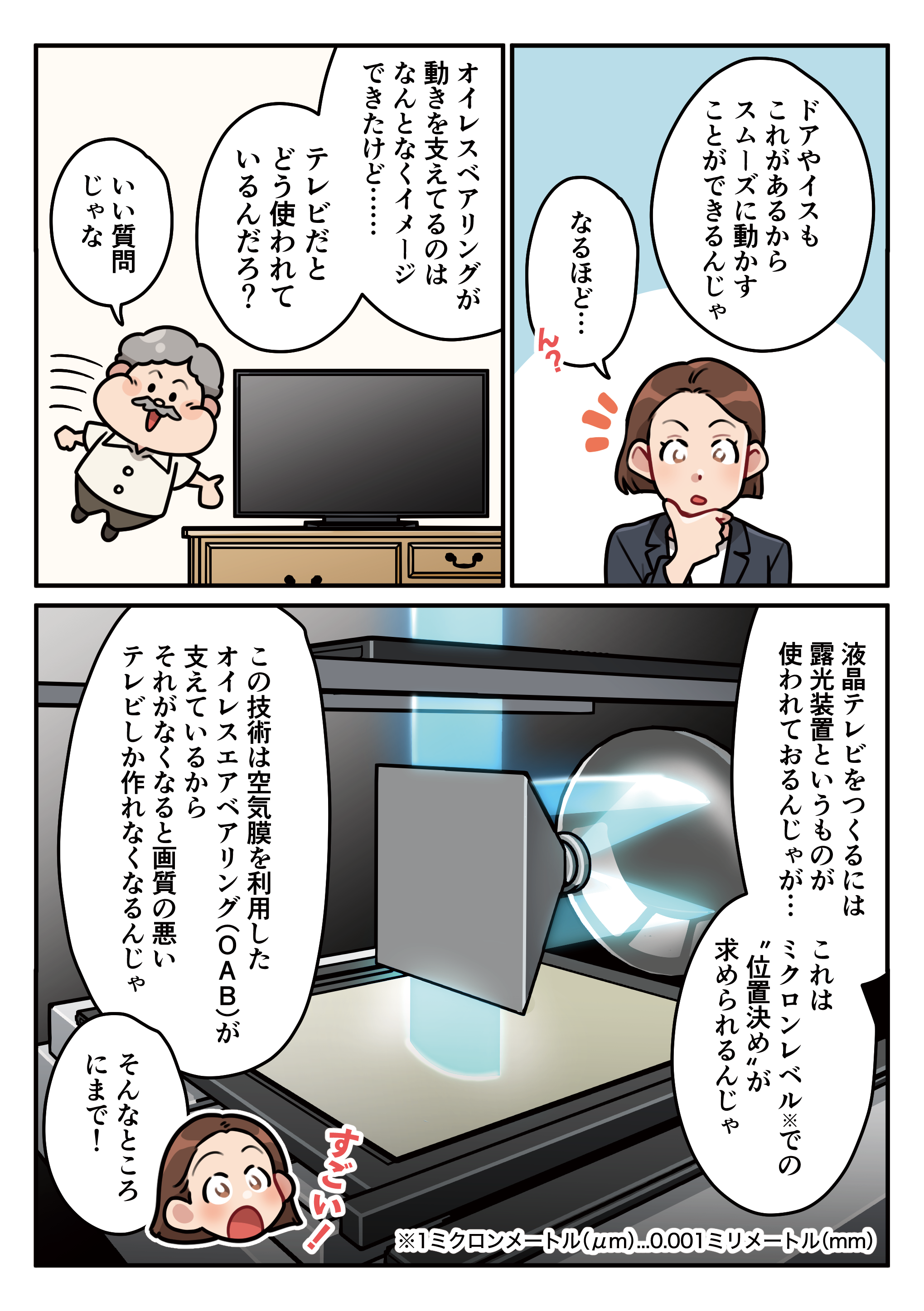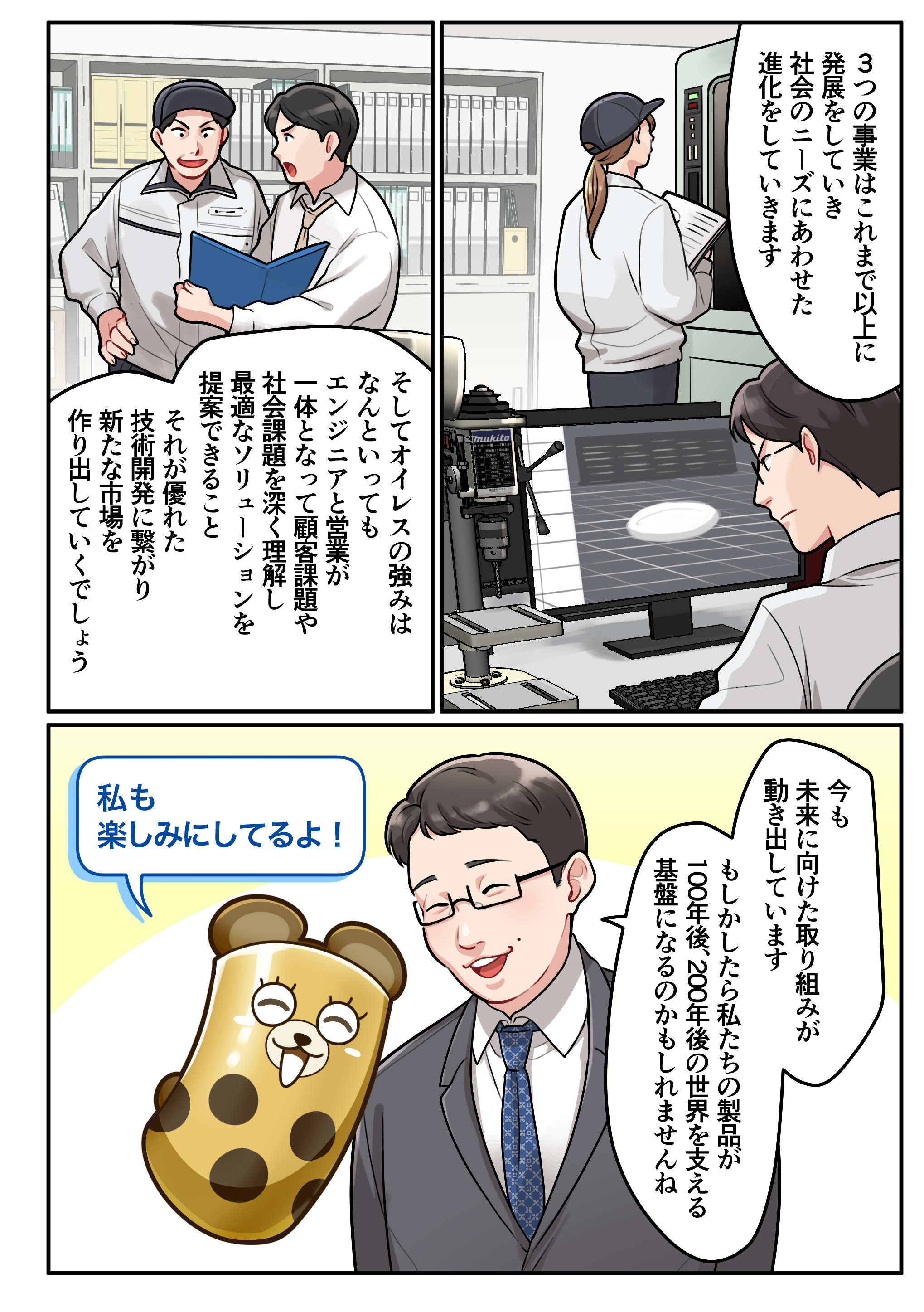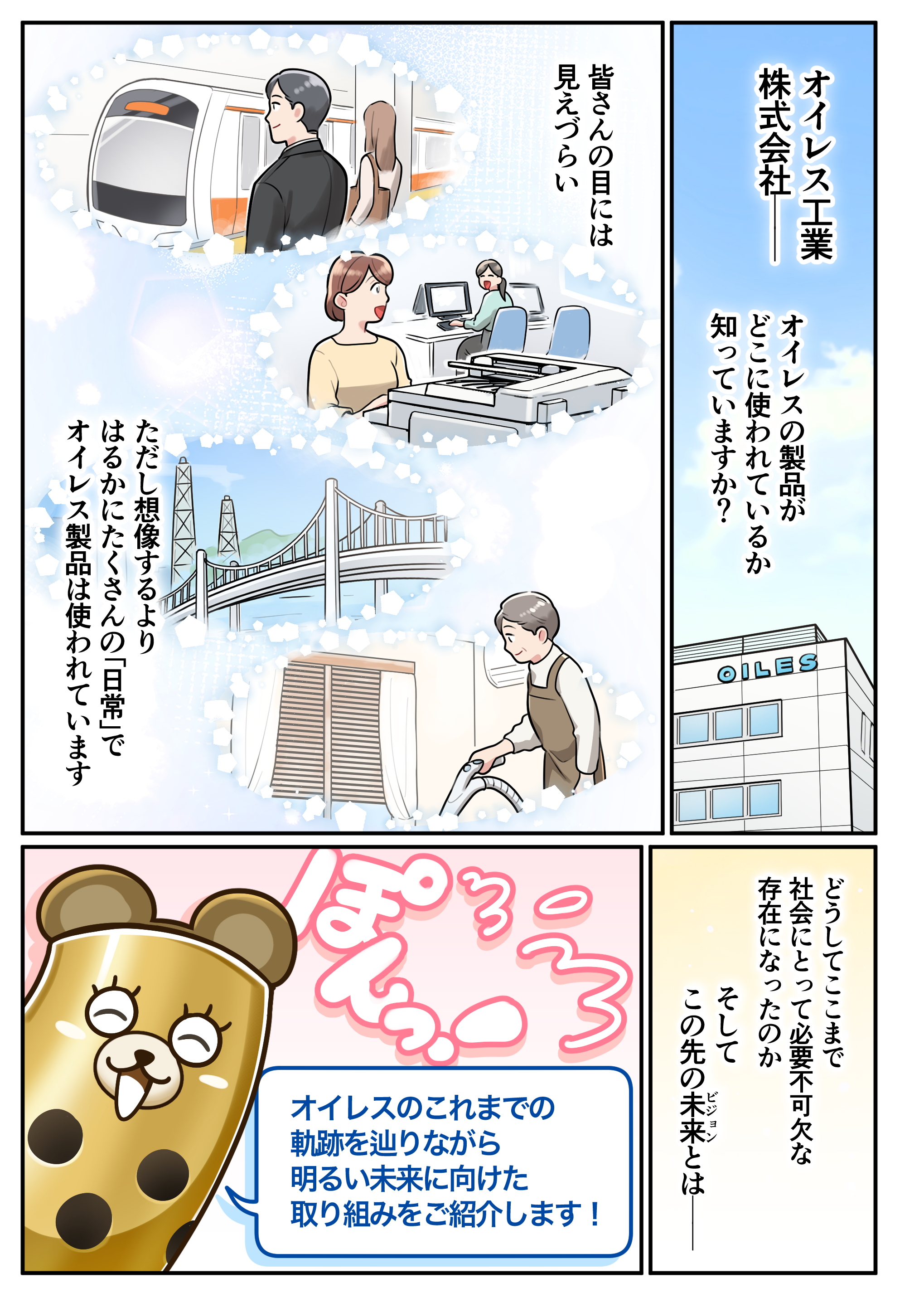 オイレス工業の事業などを漫画としてわかりやすく解説しています。
