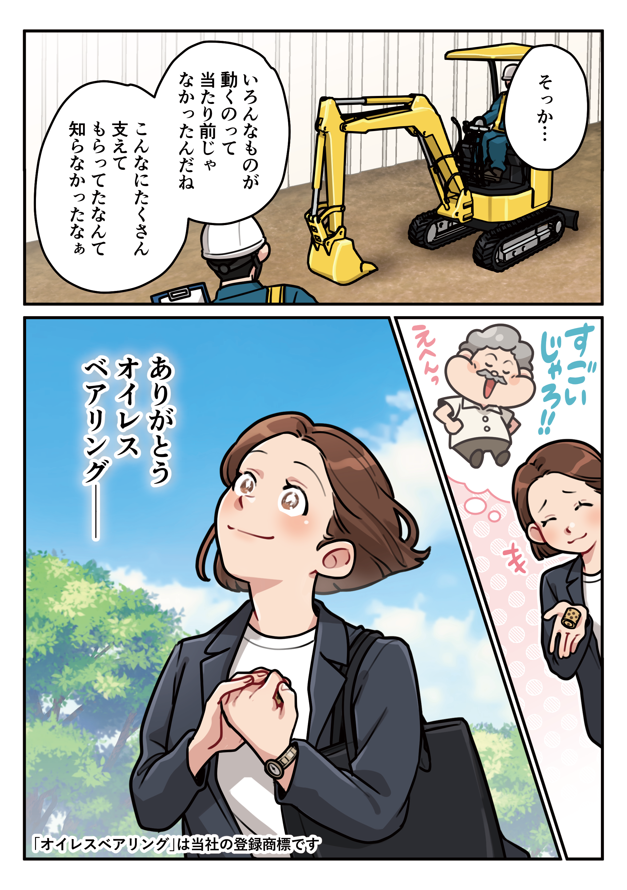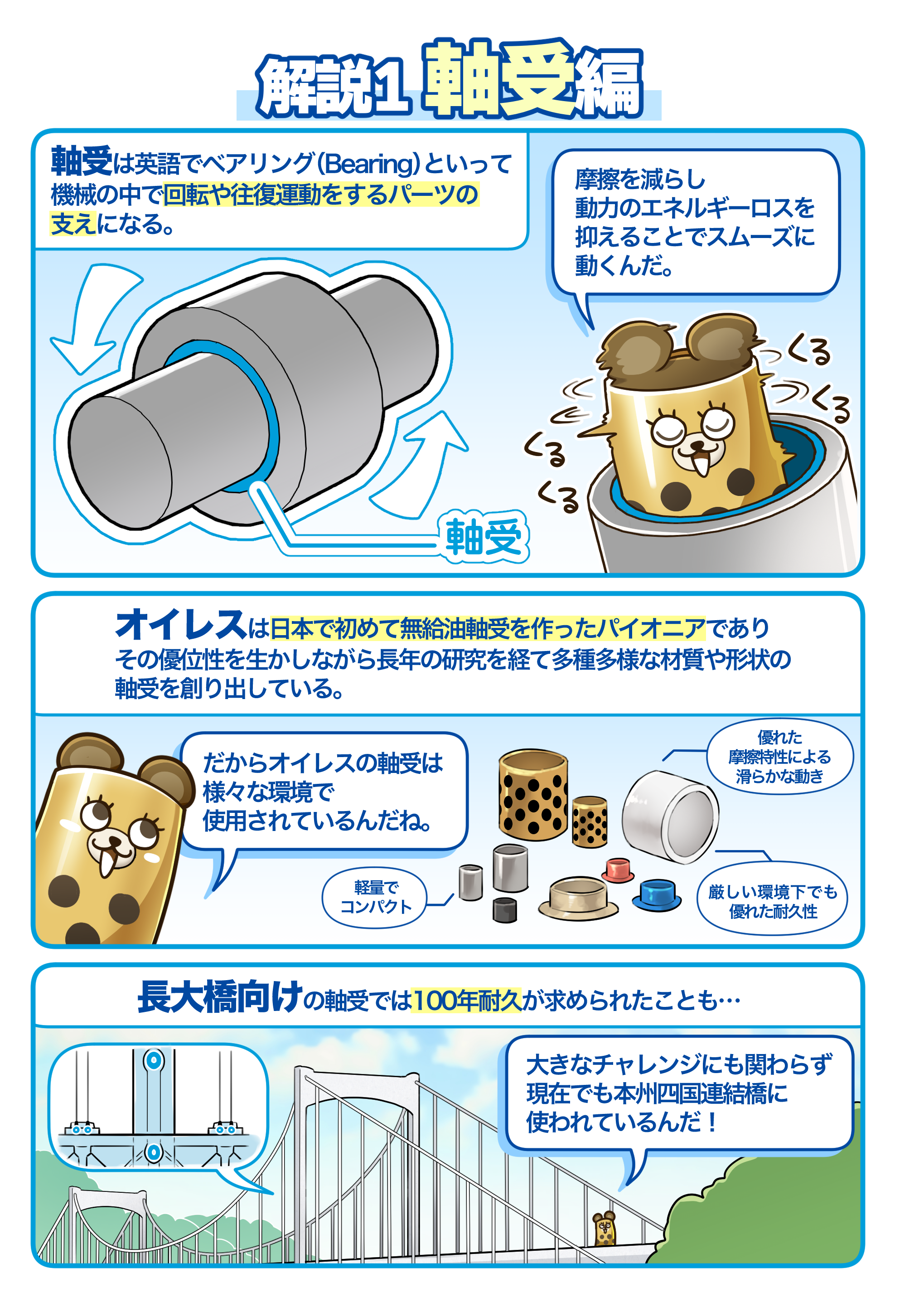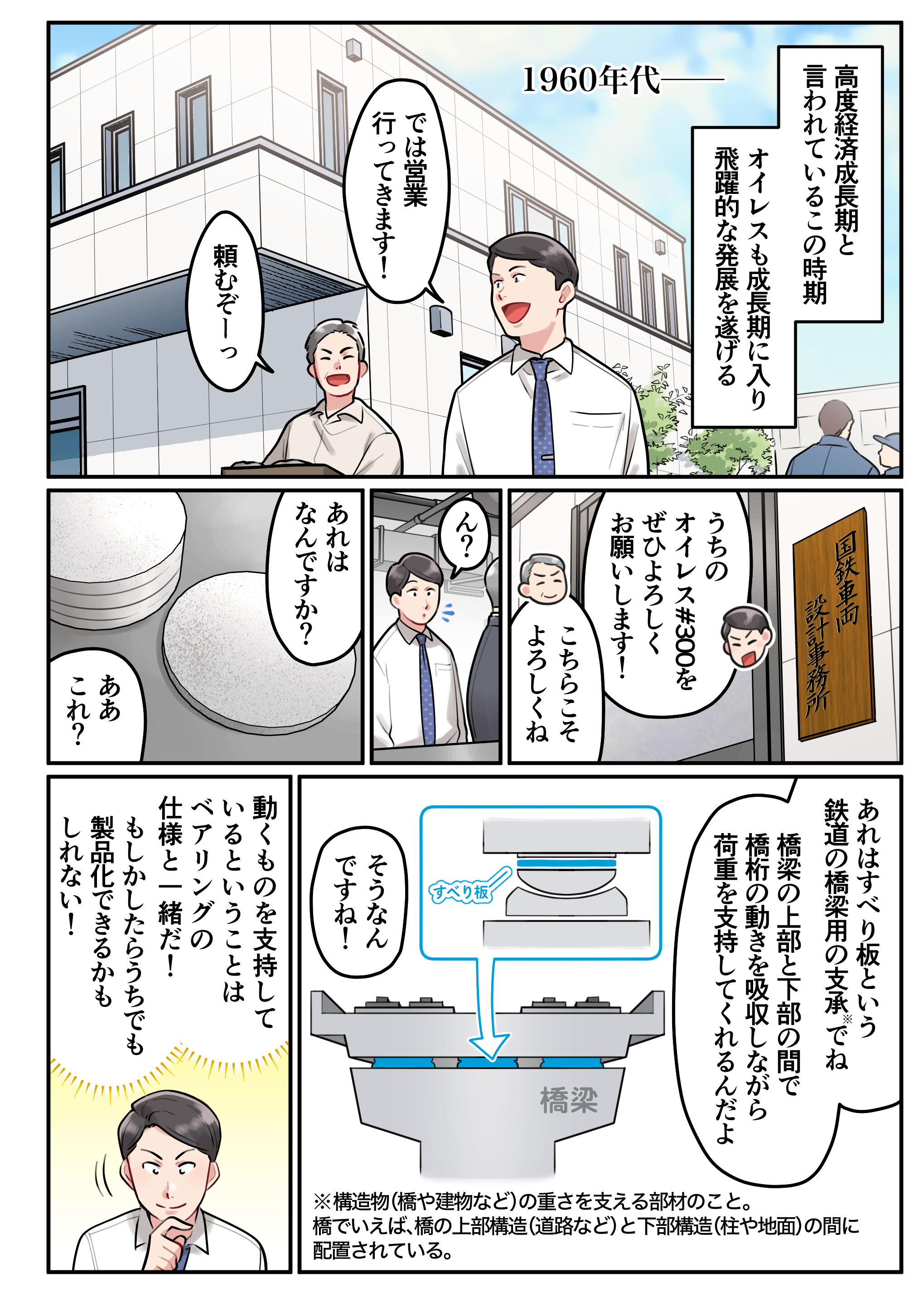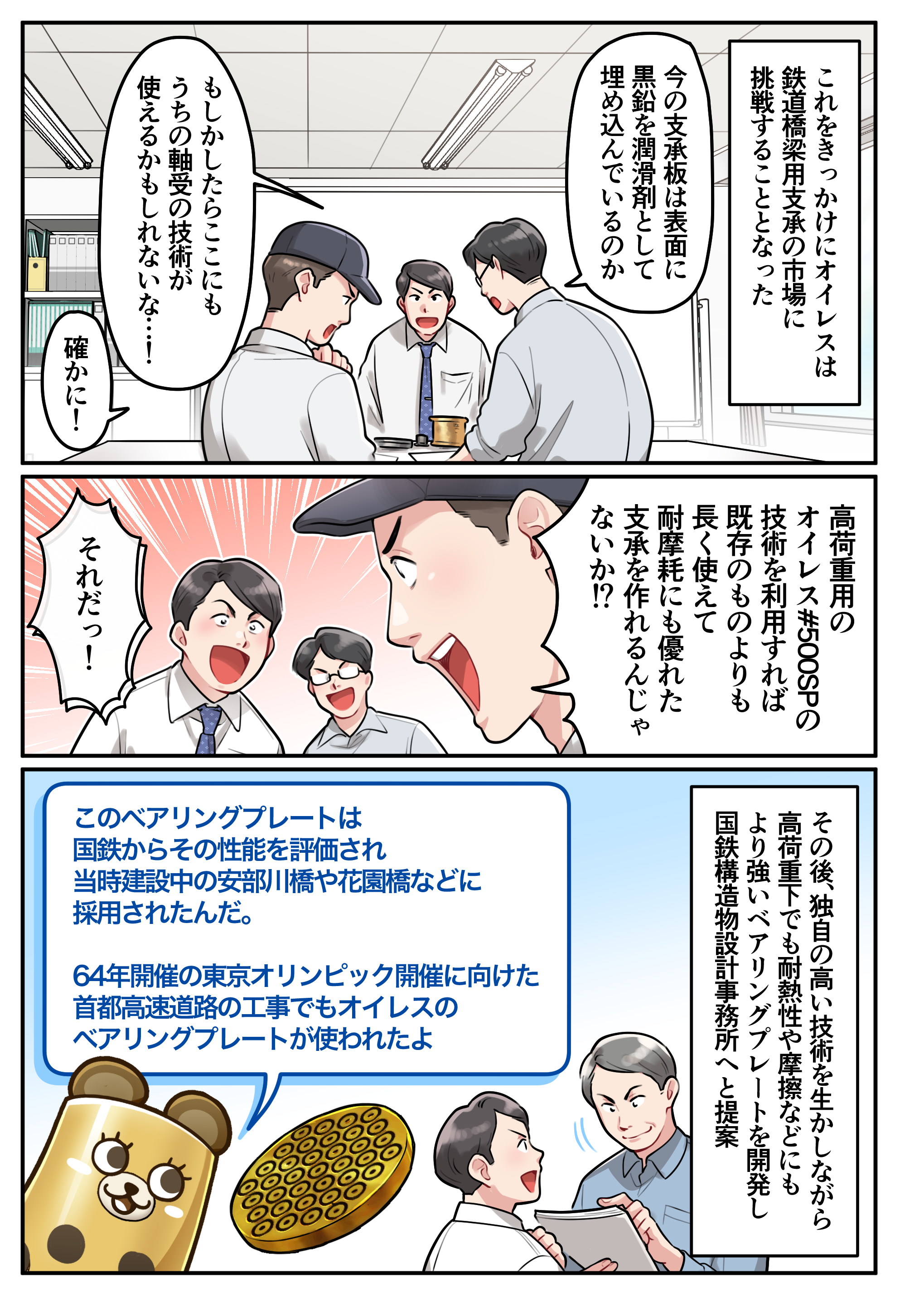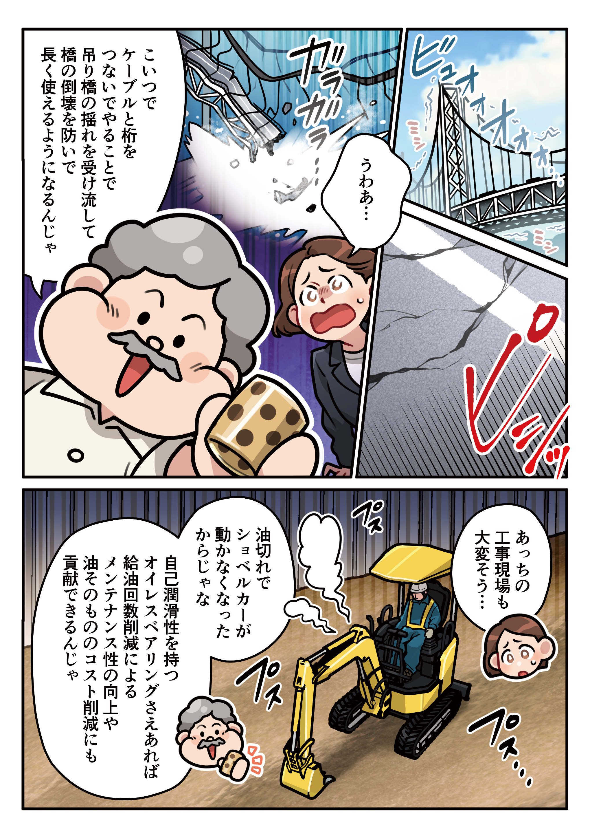 オイレスベアリングが支える世界。培ってきた技術と多様な活躍の場を、漫画にしてご紹介しています。