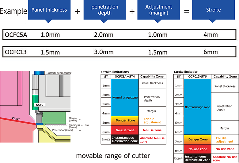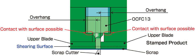 The top surface of the OCFC13 cutter holder can receive the overhanging portion of the upper blade. Please refer to the schematic drawing (P.19) for the dimensional tolerance of the holder section