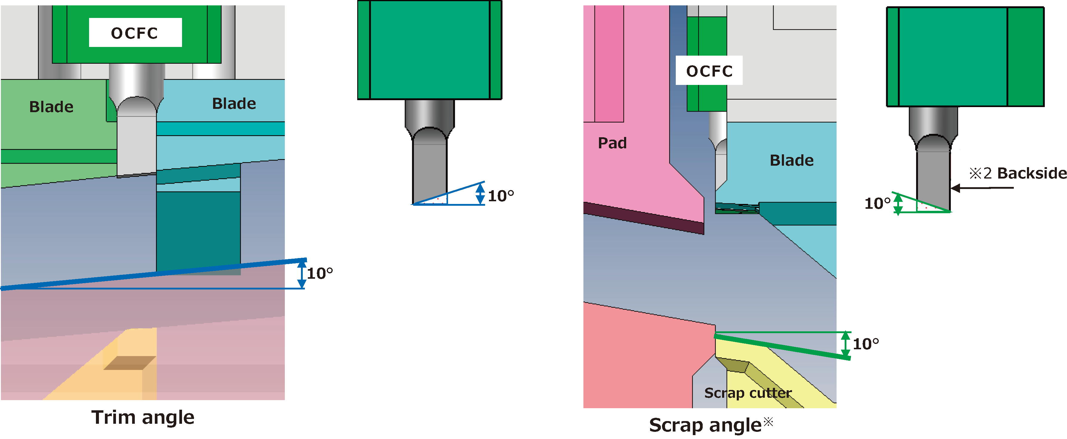 Both trim angle and scrap cutting angle should be less than 10° . However, a backup version (OCFC5A-ST4-B) with a backup plate applied to the backside of the cutter can be used for scrap cutting angles of up to 20° .
