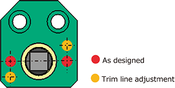 There are four dowel holes for positioning. Please use the two red markings to start with, and use the other two yellow markings when changing the trimming line.