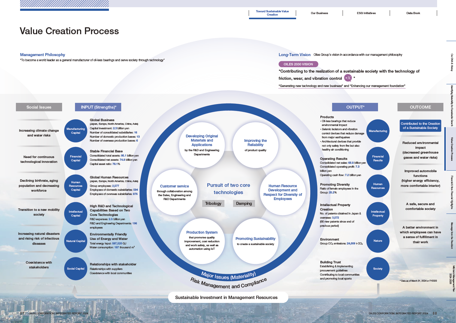 The value creation process of the Oiles Group indicates how we can utilize our capital to contribute to achieving a sustainable society for our stakeholders and the community at large. The two core technologies of tribology and damping are the source of our value creation, and we aim to achieve continuous growth together with society as we look to achieve our management philosophy of "serving society through technology."