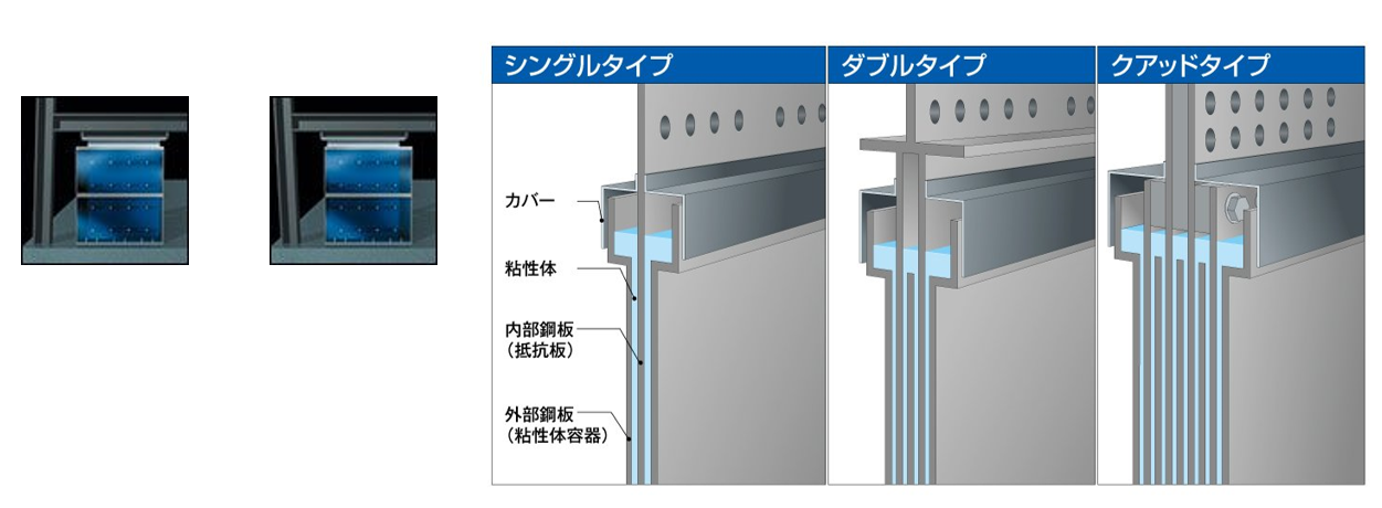 高粘度の粘性体の粘性せん断抵抗力を利用した制震装置で、粘性体を充填した外部鋼板(粘性体容器)の間に、内部鋼板(抵抗板)を挿入したものです。
