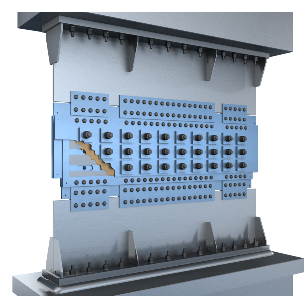 これらをPC鋼棒によって締め付けることで摩擦材に軸力を伝達します。固定板と可動板が相対移動することにより、摩擦面に摩擦力が発生し摩擦抵抗力を得ます。